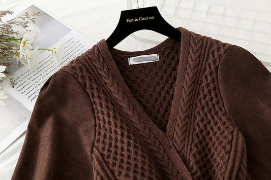Nouvelle jupe noire courte en tricot torsadé à col en V et manches bouffantes cousues, longueur genou, 2241