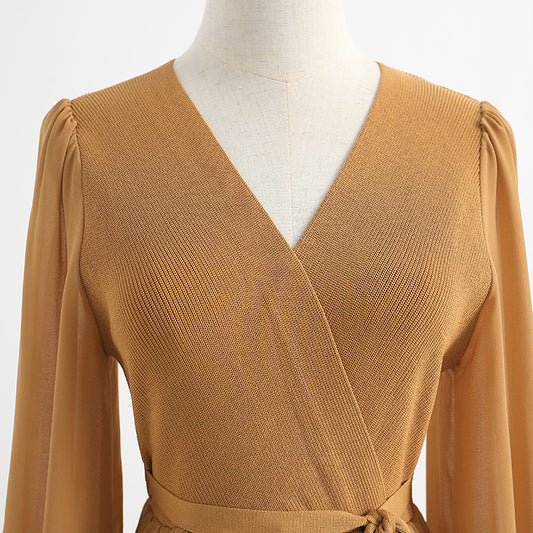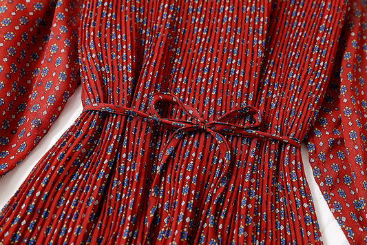 Robe col en V manches longues jupe plissée patchwork jupe courte 2140