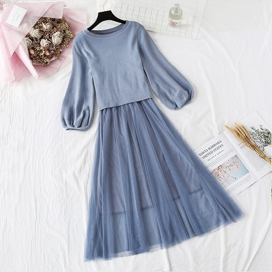 Ensemble deux pièces à la mode avec jupe en maille et bretelles féeriques à manches bouffantes 2146