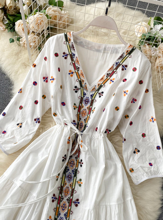 Robe trapèze à manches longues et col en V avec broderie 1179