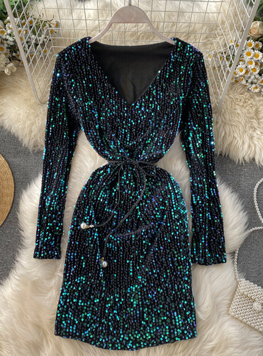 Robe courte à manches longues et paillettes brillantes pour femme 1173