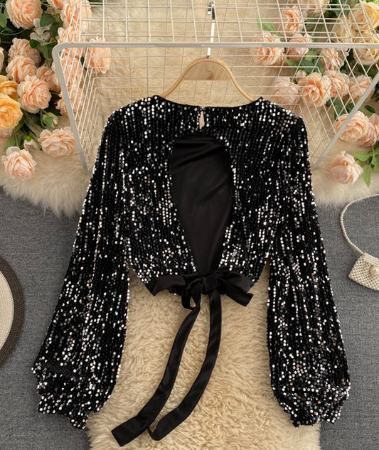 Hauts à paillettes brillantes à manches longues et dos ouvert 368