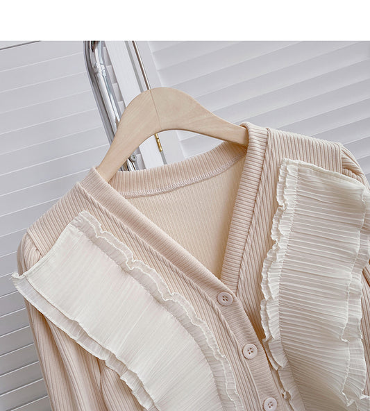 Cardigan chemise vintage à col en V en dentelle froncée 6408