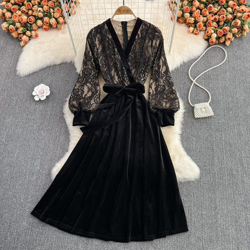 Robe trapèze noire à col en V et dentelle 10888