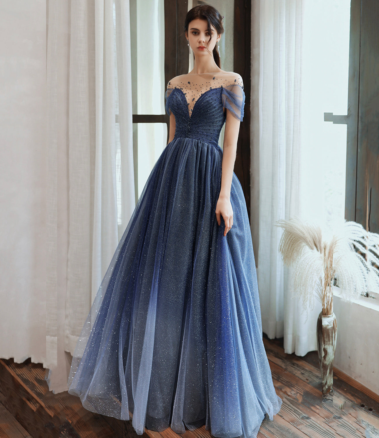 Robe de soirée longue en tulle bleu à paillettes 10477