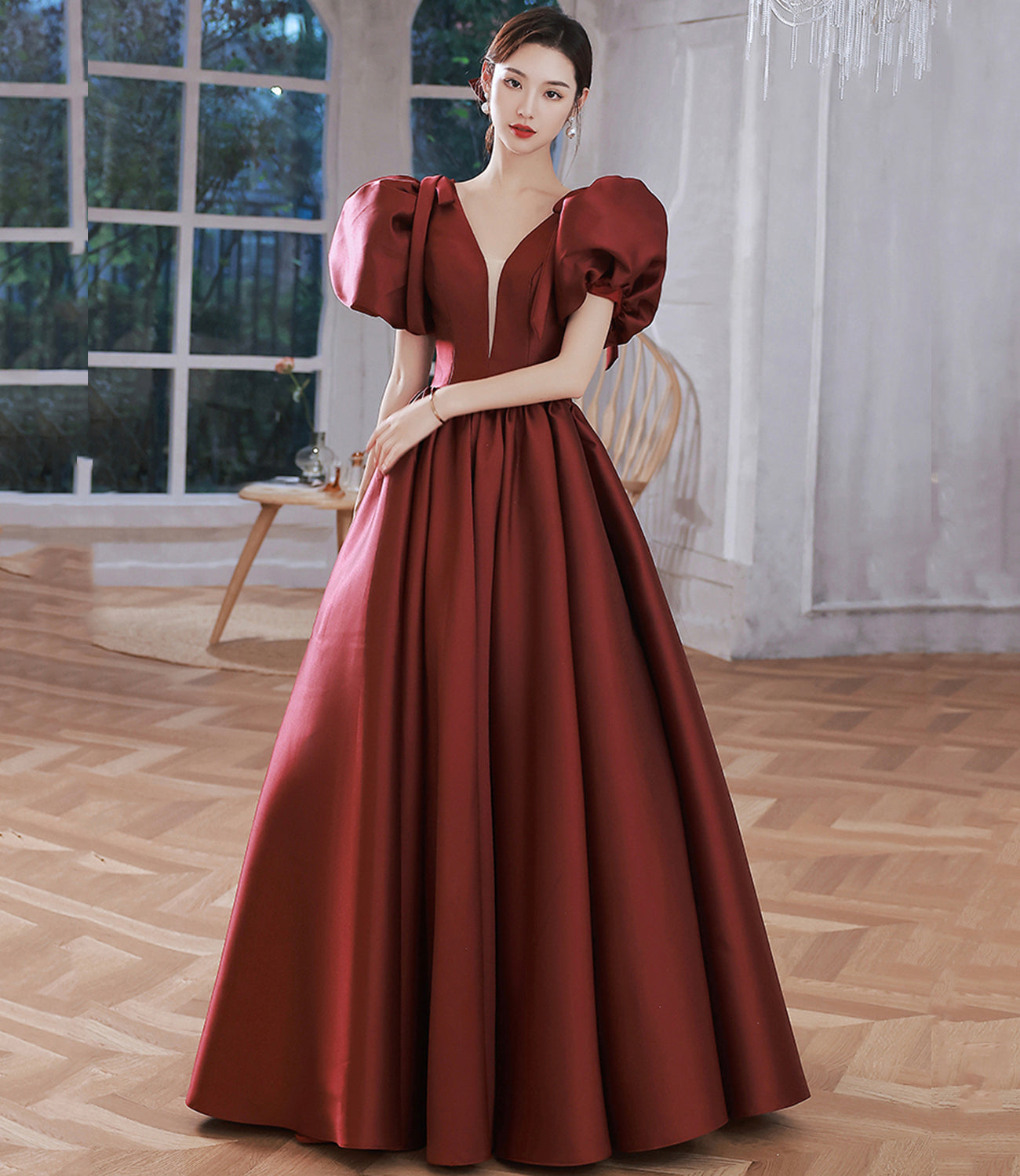 Robe de bal longue en satin bordeaux à col en V Robe de soirée trapèze 10212
