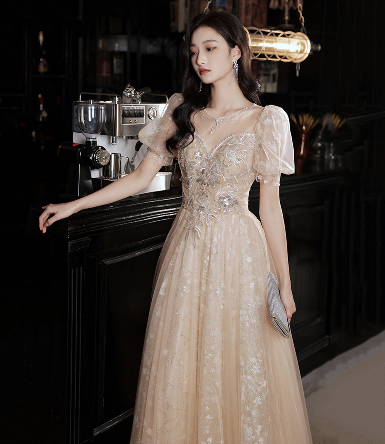Robe de soirée longue en tulle à paillettes champagne 10325