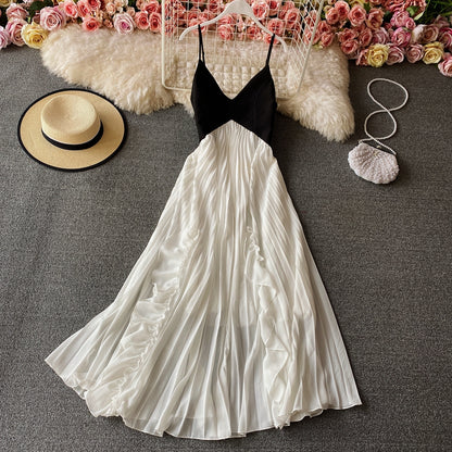 Robe trapèze mignonne à col en V Robe tendance noire et blanche 10810