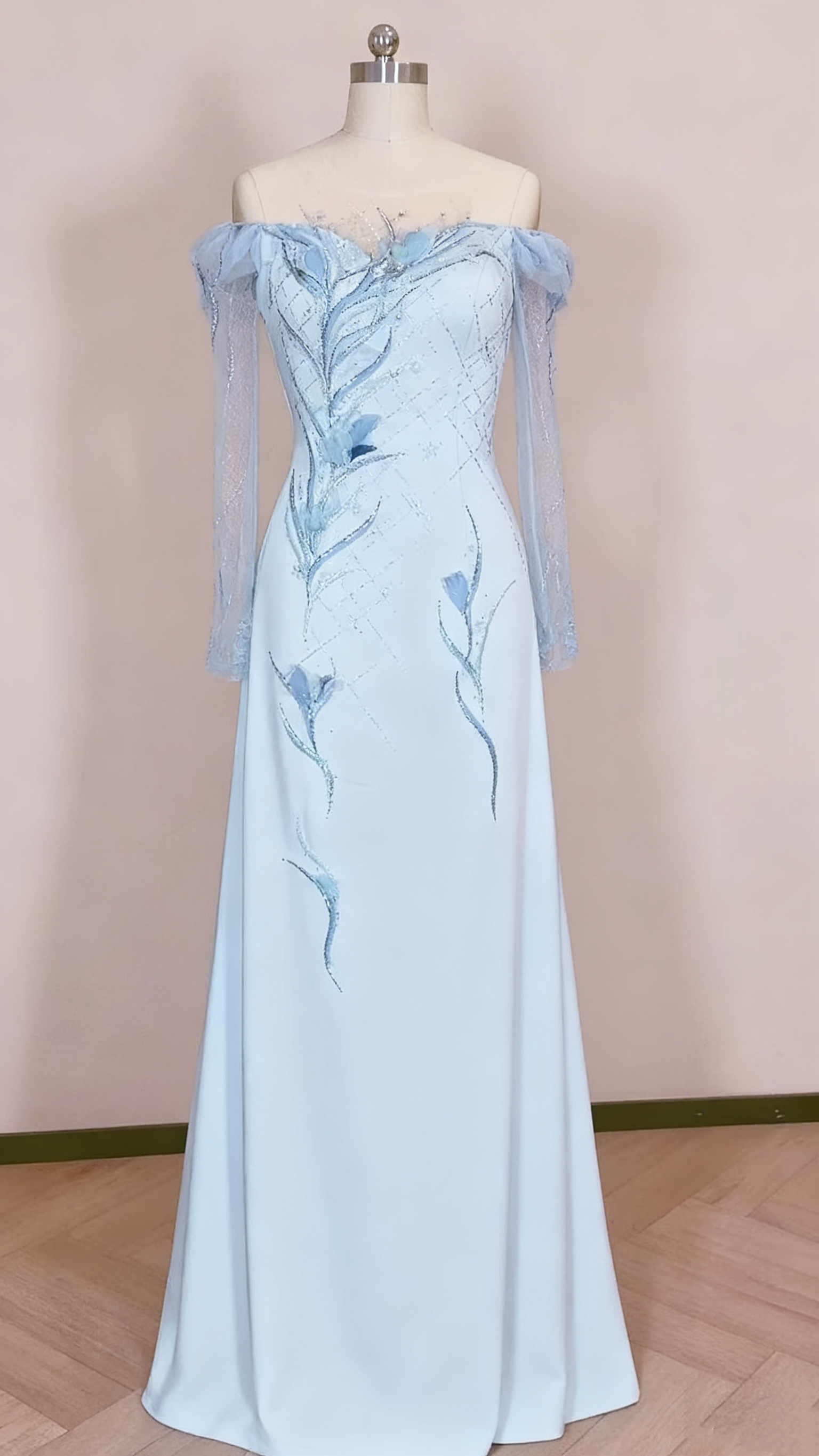 Robe de soirée bleu clair en satin transparent, manches longues, ornée de perles et de fleurs, longueur au sol gh6389