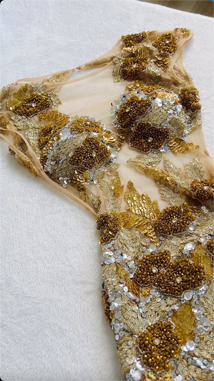 girlhomeshops - Robe sirène or champagne à perles lourdes, robe de soirée luxueuse ornée de sequins et de fleurs 3D gh6003