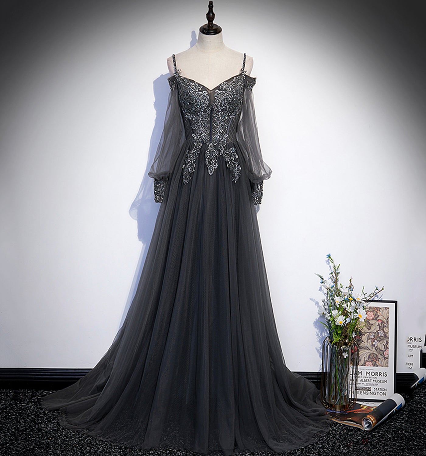 Robe de bal longue en tulle et dentelle grise Robe de soirée trapèze