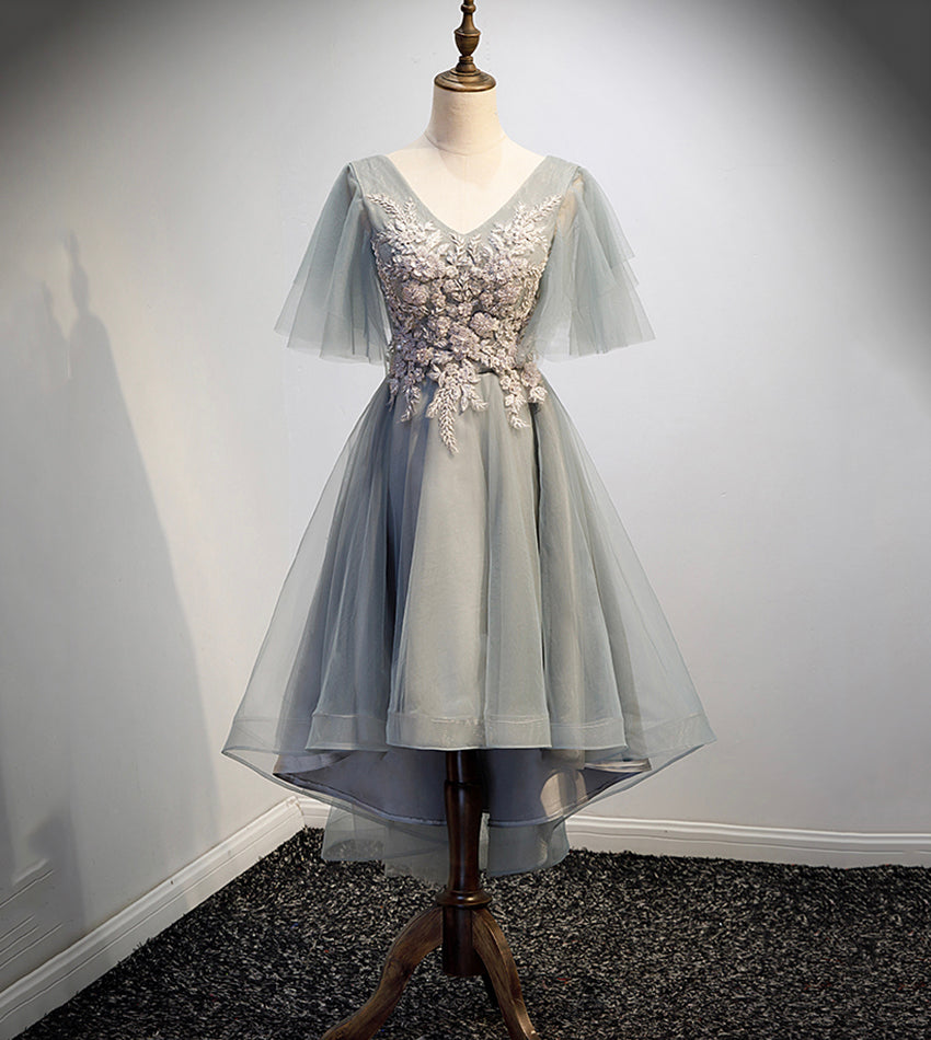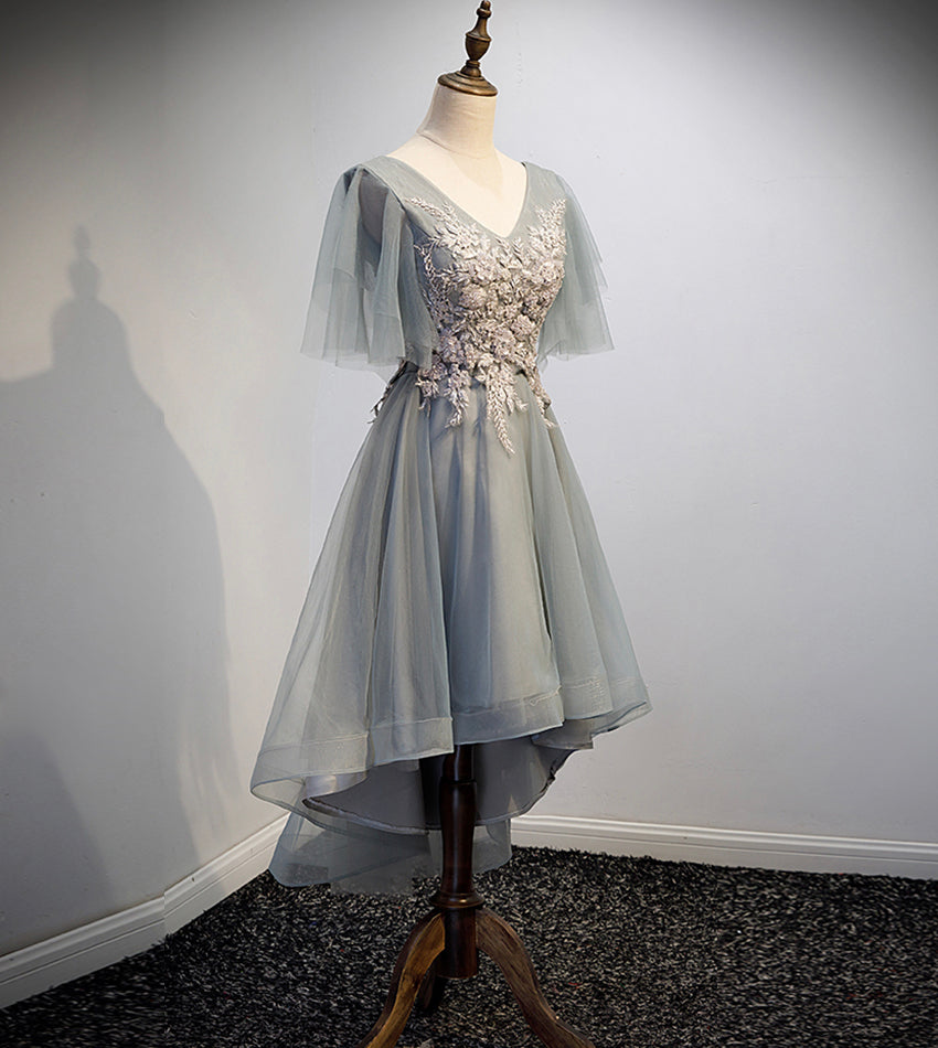 Robe de soirée courte en tulle et dentelle grise, coupe haute et basse