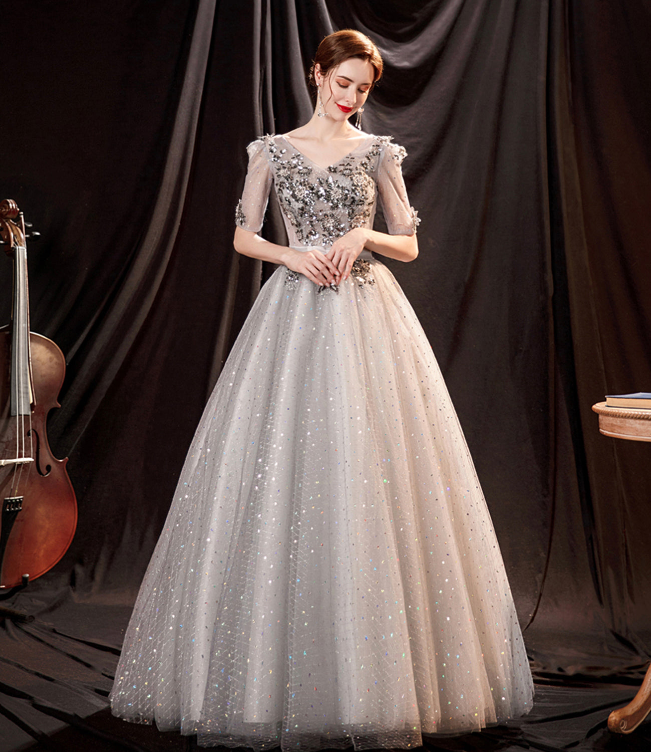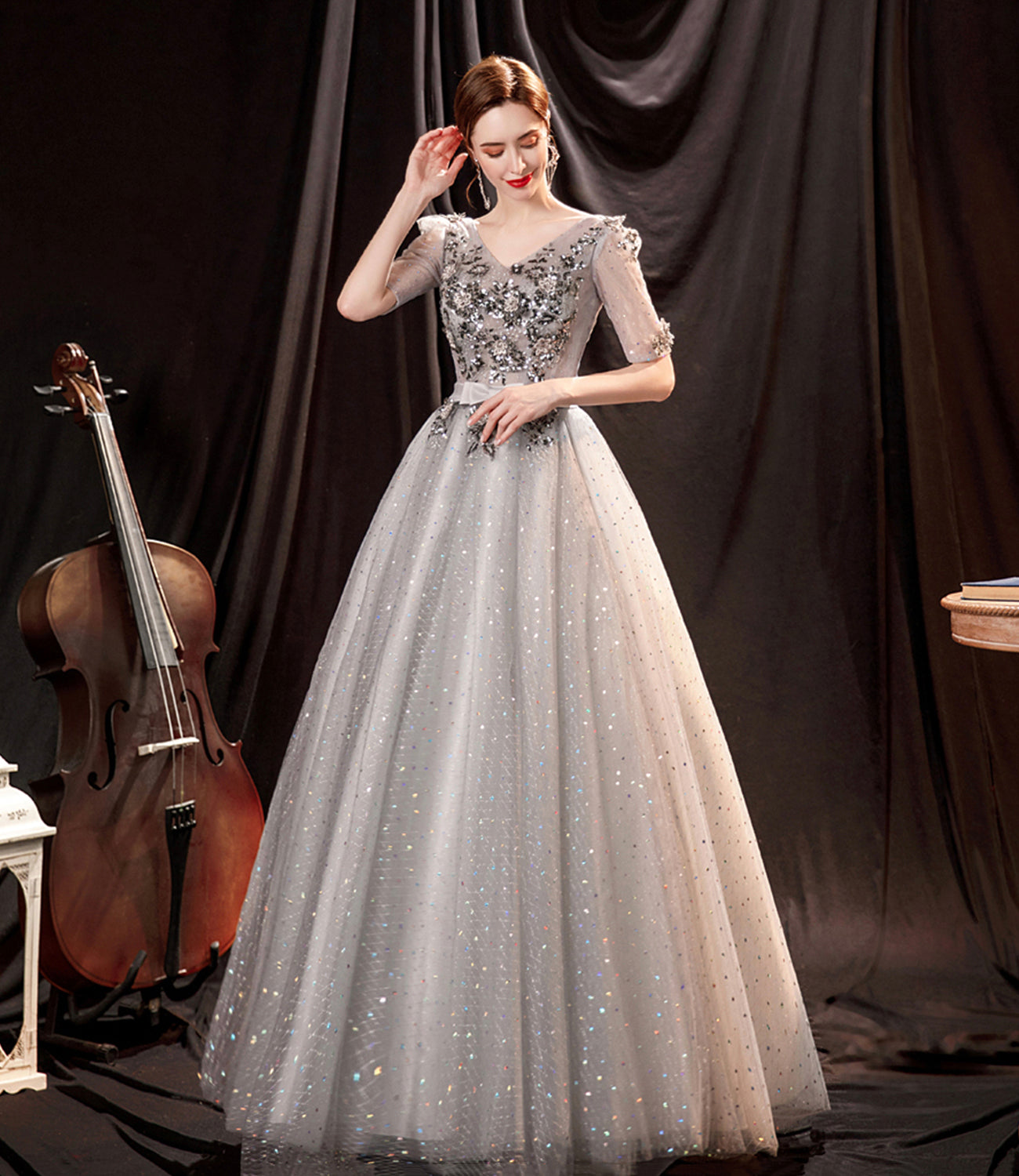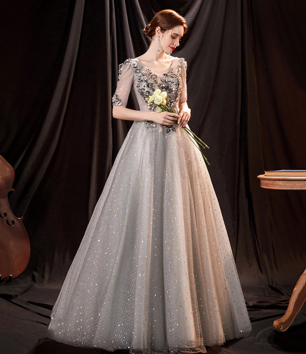 Robe de soirée longue en tulle gris à paillettes Robe de soirée trapèze
