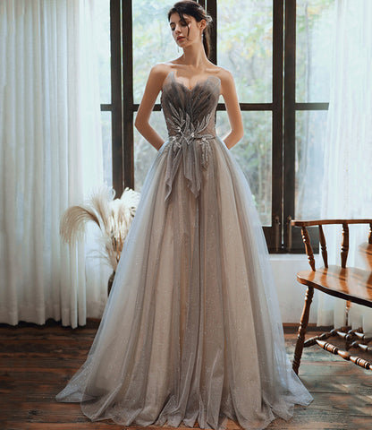Robe de soirée longue en tulle gris à paillettes Robe de soirée trapèze