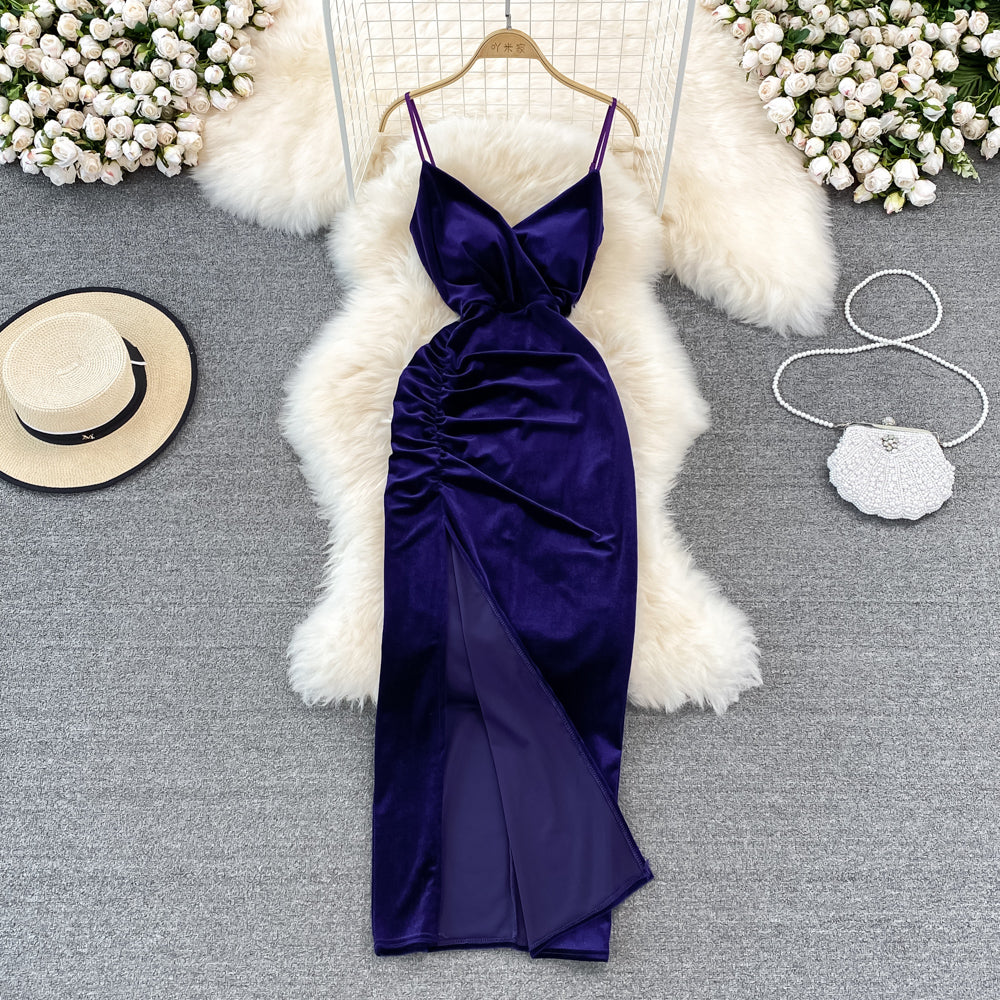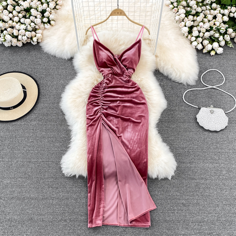 Robe à bretelles en velours doré avec dos ouvert et fente 11055