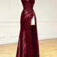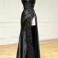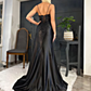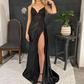 Robe de soirée longue en satin noire élégante et sexy avec col en V et bretelles spaghetti en dentelle exquise et fentes latérales gh2611