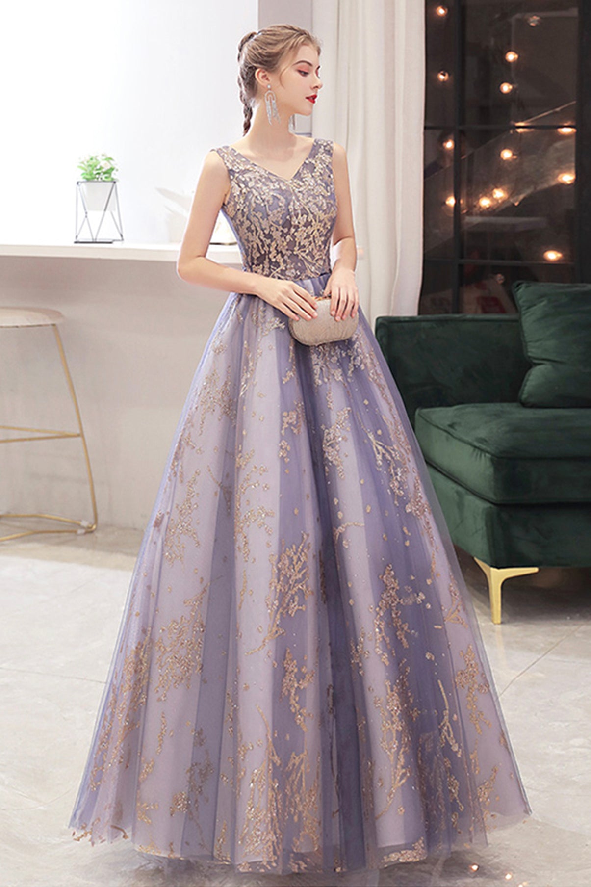 Robe de bal longue en tulle à paillettes et col en V