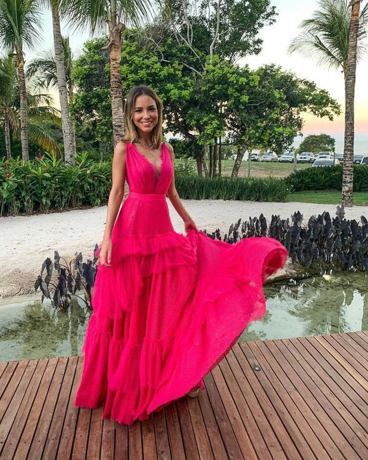 Robe de soirée longue en mousseline de soie à volants, élégante et sexy, col en V, en dentelle, bretelles spaghetti, robe de bal, robe de soirée pour invités de mariage, gh3322