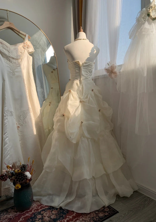Robe de soirée élégante et exquise en tulle, longueur au sol, à volants, motif floral, ivoire, gh4133