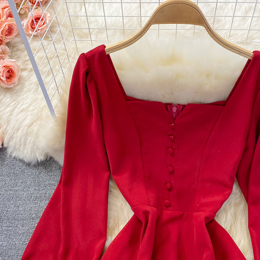 Robe mi-longue à taille haute et col carré rouge 3361