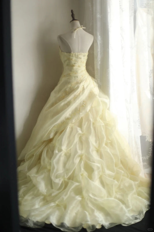 Girlhomeshops - Robe de mariée princesse jaune rétro à col licou et manches bouffantes (gh5425)