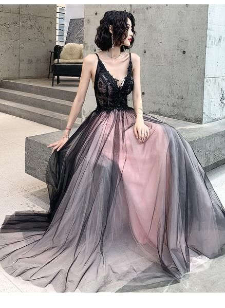 Robe de soirée à décolleté en V en tulle rose et noir à la mode, robe de soirée à appliques en dentelle rose gh2623