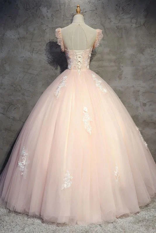 Robe de bal longue en tulle pêche clair avec fleurs, robe de bal princesse à col transparent, robe de soirée gh990