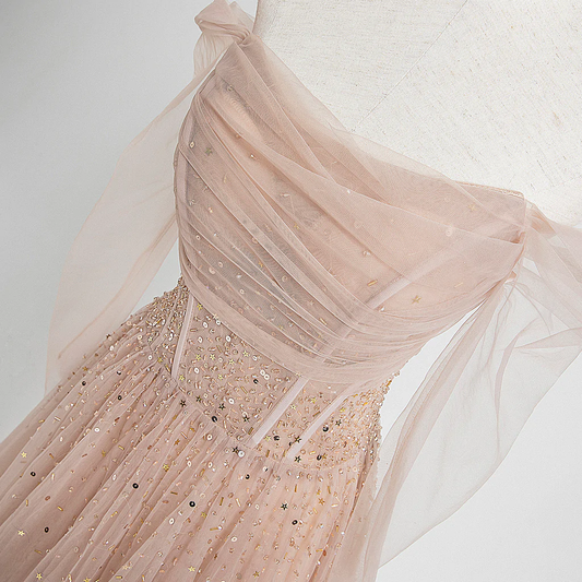 Robe de bal rose perle à épaules dénudées et manches longues à paillettes, robe de soirée trapèze, robe formelle gh228