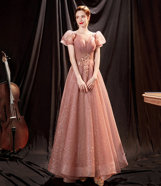 Robe longue de soirée en tulle à manches courtes couleur champagne clair, longueur au sol, coupe trapèze, robes de soirée gh15