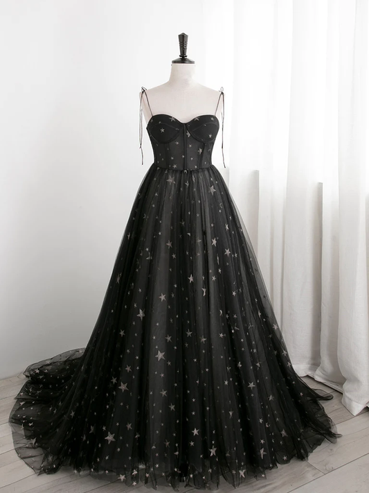 Robe de soirée longue noire à bretelles en tulle, robe de soirée noire formelle, robe de bal gh11