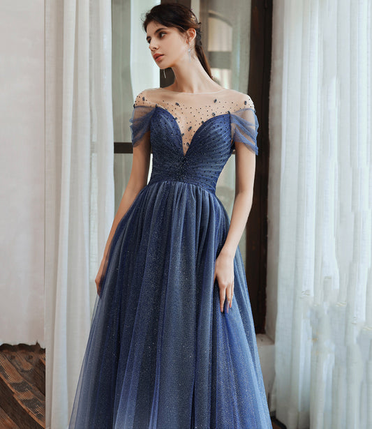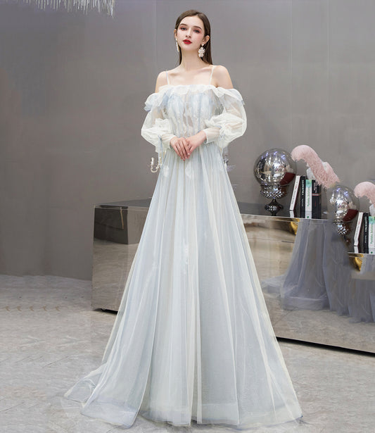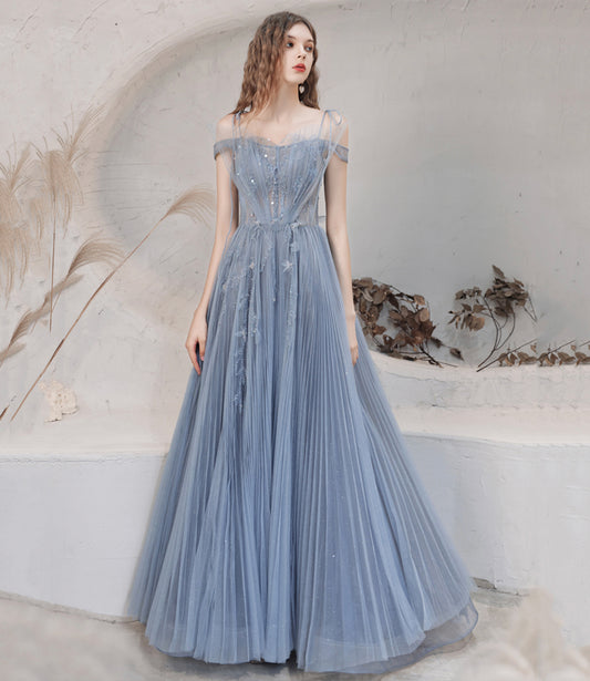 Robe de bal longue en tulle bleu et dentelle, robe de soirée 10475
