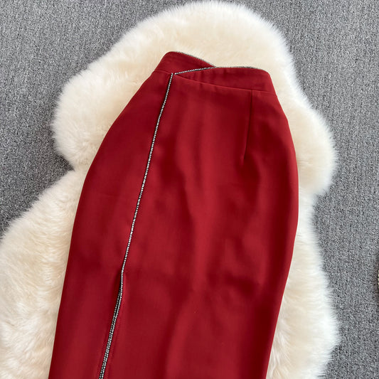 Jupe portefeuille slim taille haute polyvalente, jupe fendue mi-longue en une étape 11284
