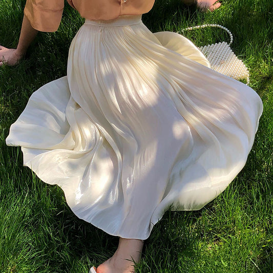 Jupe mi-longue en soie ammoniaque cuivrée lumineuse, jupe soyeuse brillante à plis nacrés, jupe midi trapèze 3591