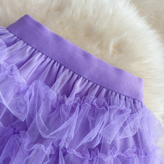 Nouveau style, taille haute, couleur unie, ourlet irrégulier, jupe pompeuse à épissure en maille, jupe ample trapèze 3527