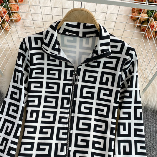 Manteau ample décontracté à col montant et fermeture éclair à imprimé léopard coréen 1678