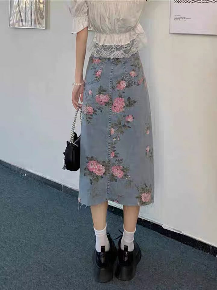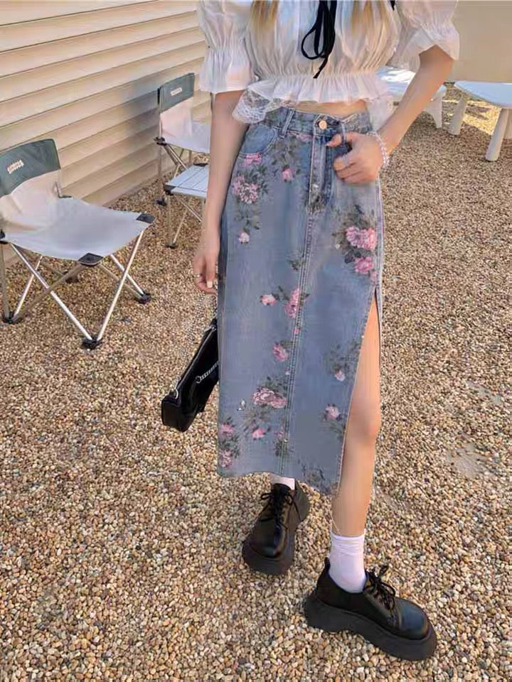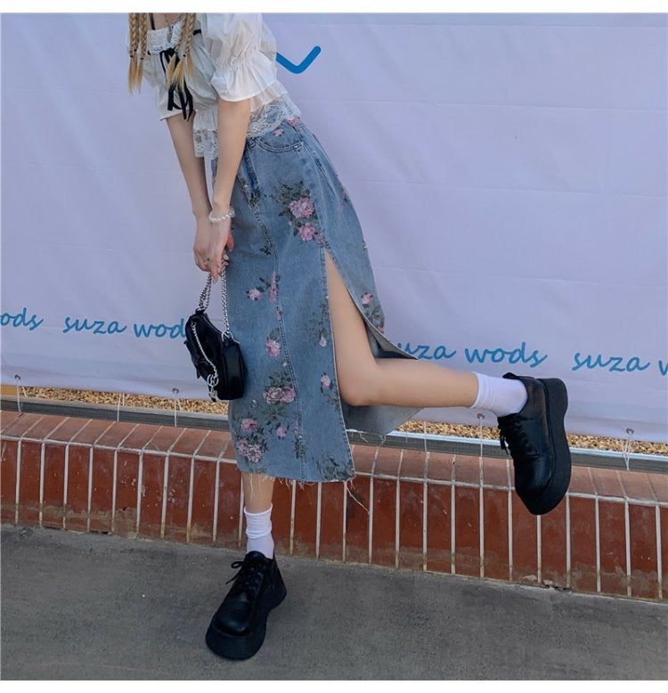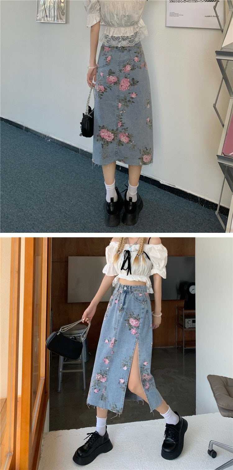 Jupe en jean, jupe trapèze mi-longue avec fente florale 3551