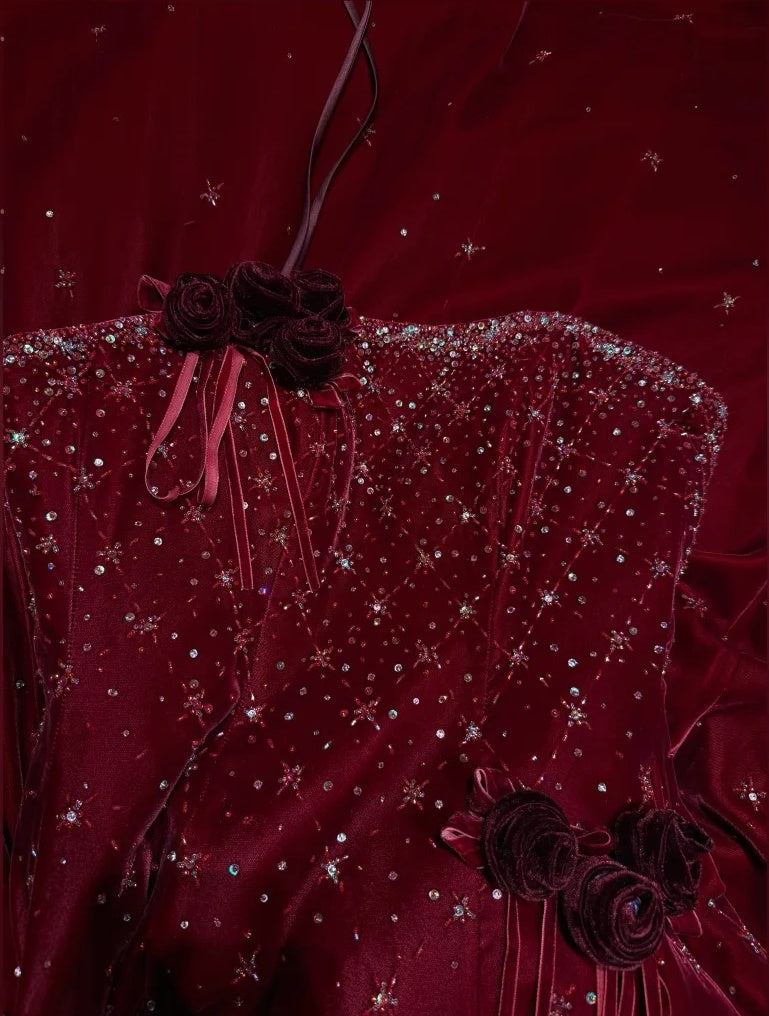 Girlhomeshops - Robe de soirée longue en velours bordeaux, exquise et perlée, tenue de bal, de remise de diplôme, gh5974