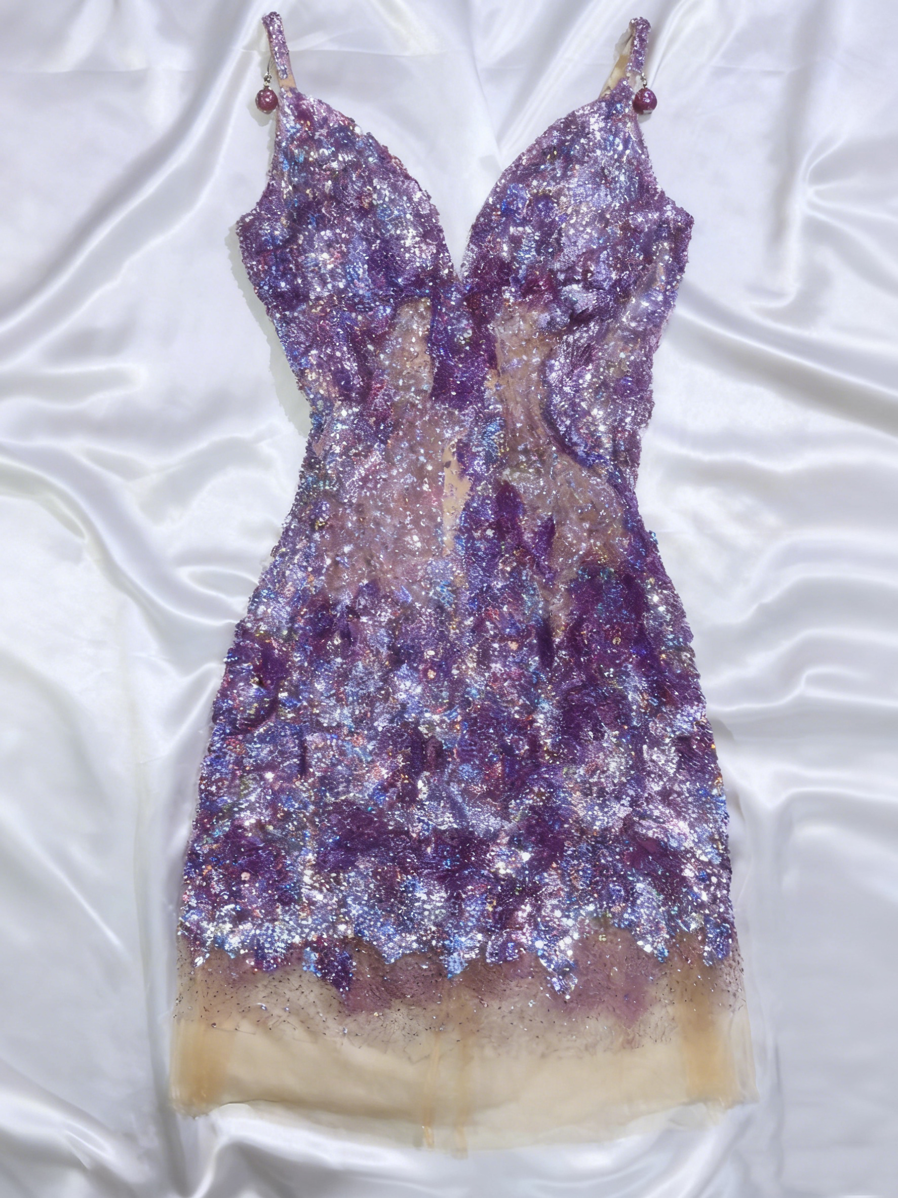 Robe moulante mini à fines bretelles et sequins dégradés violet-bleu gh6400