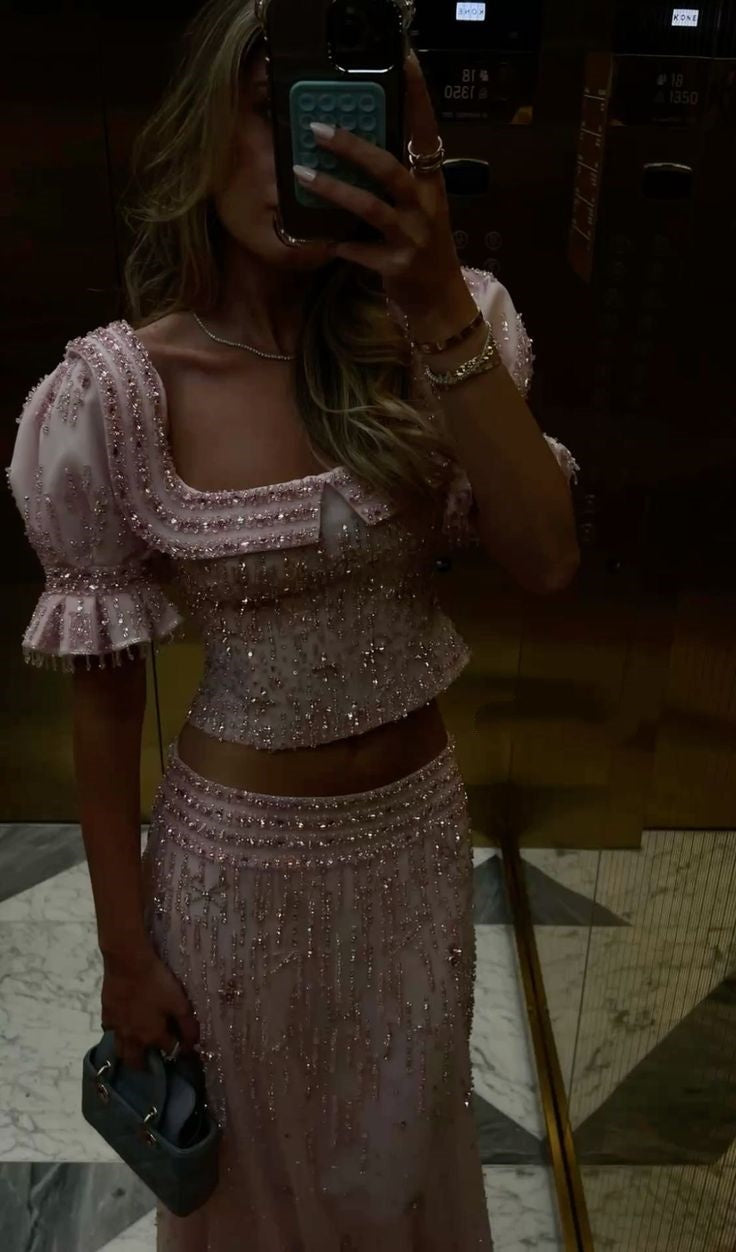 Robe deux-pièces rose en tulle à manches courtes et perles | Robe maxi élégante et luxueuse à encolure carrée découpée, idéale pour une soirée de gala gh6465