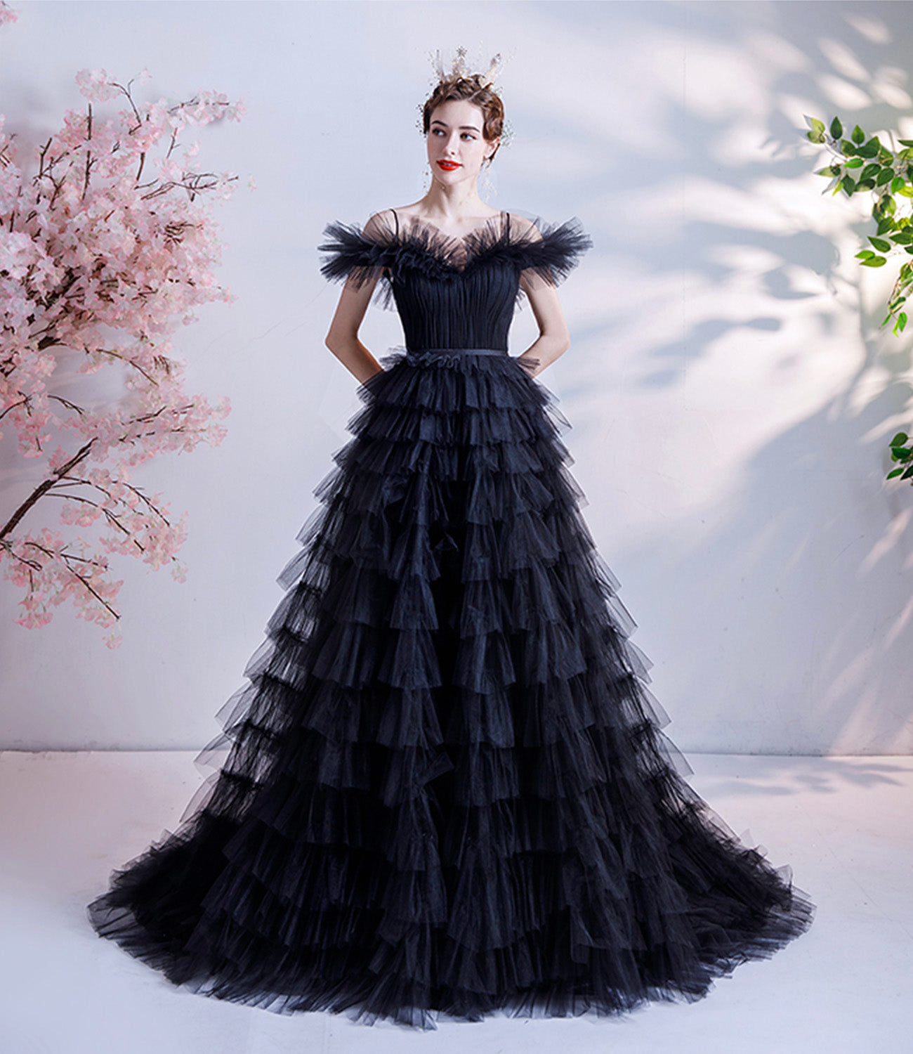 Black tulle long A line prom dress black evening dress