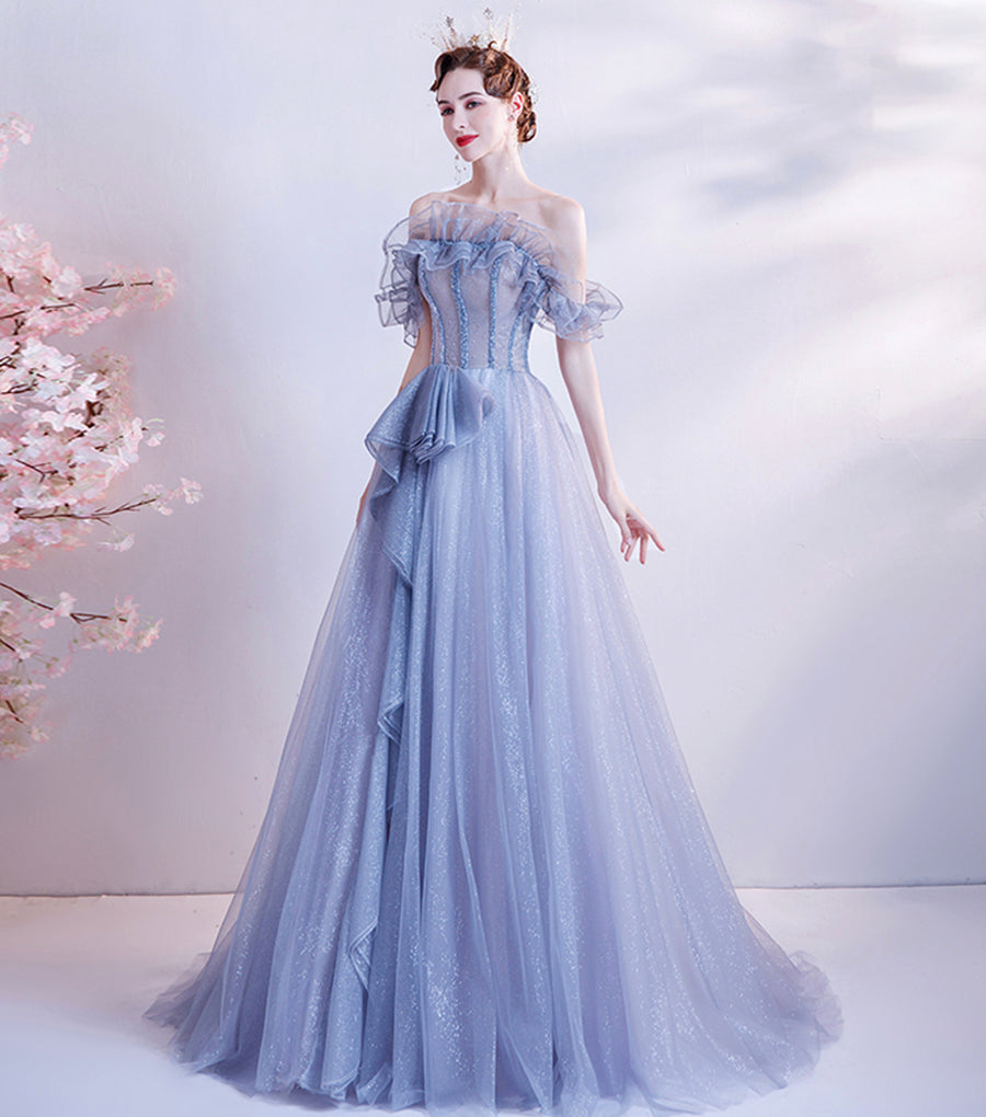 Blue tulle sequins long ball gown dress formal dress
