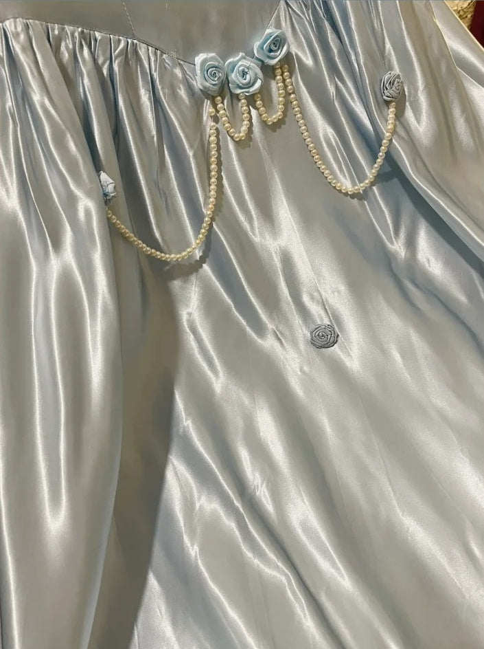 Blue Vintage Elegant Floral Long Satin Floor Length Ball Gown Evening Dress gh4415