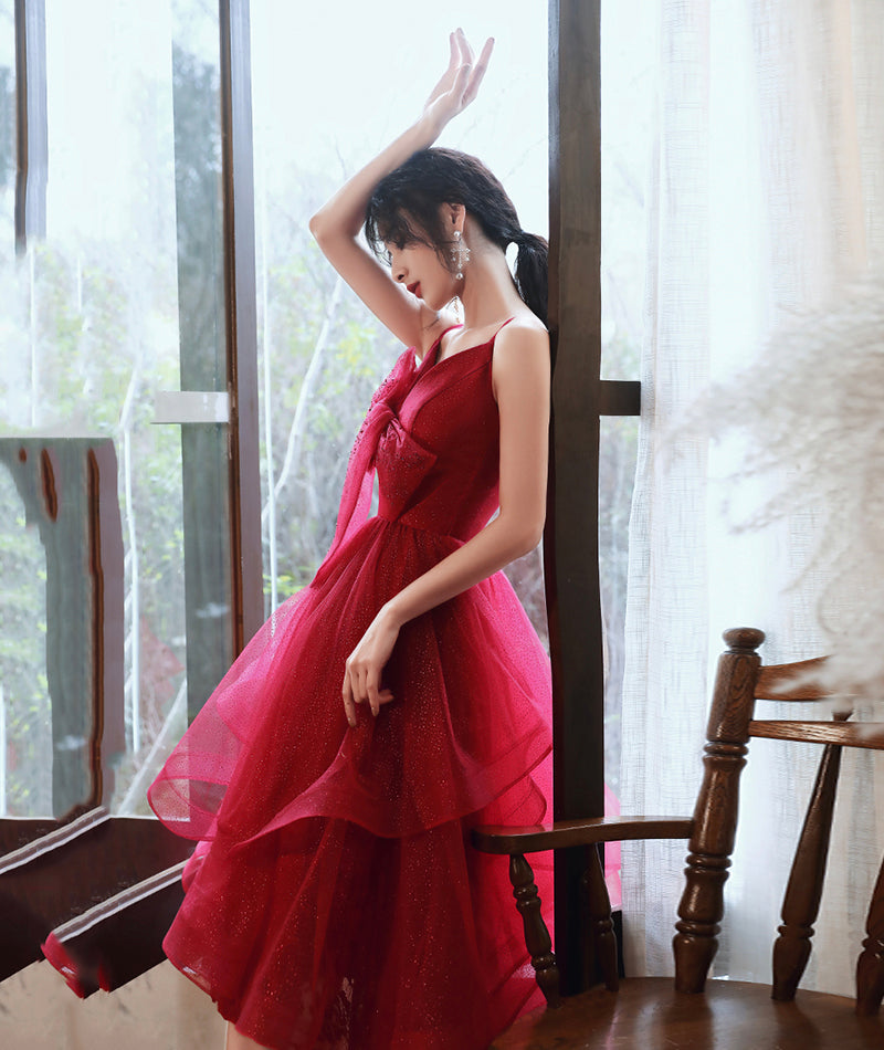 Burgundy v neck tulle sequins prom dress homecoming dress 8408