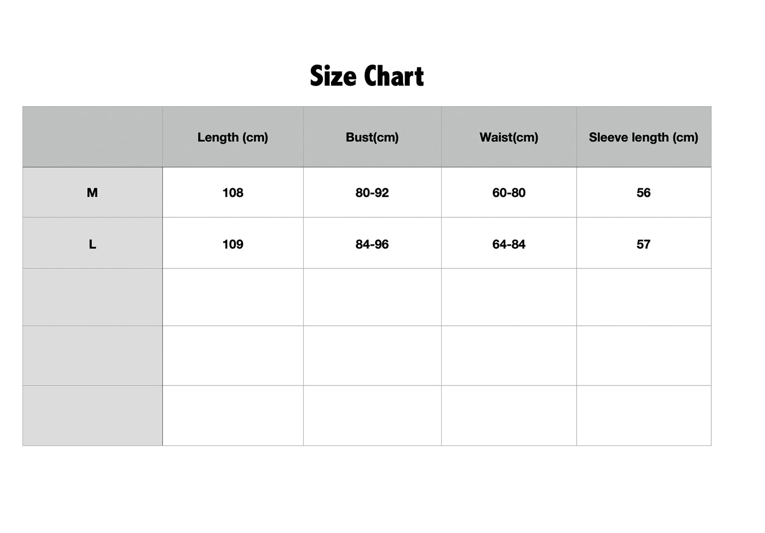 L length 109 bust 84-96 waist 64-84 sleeve length 57