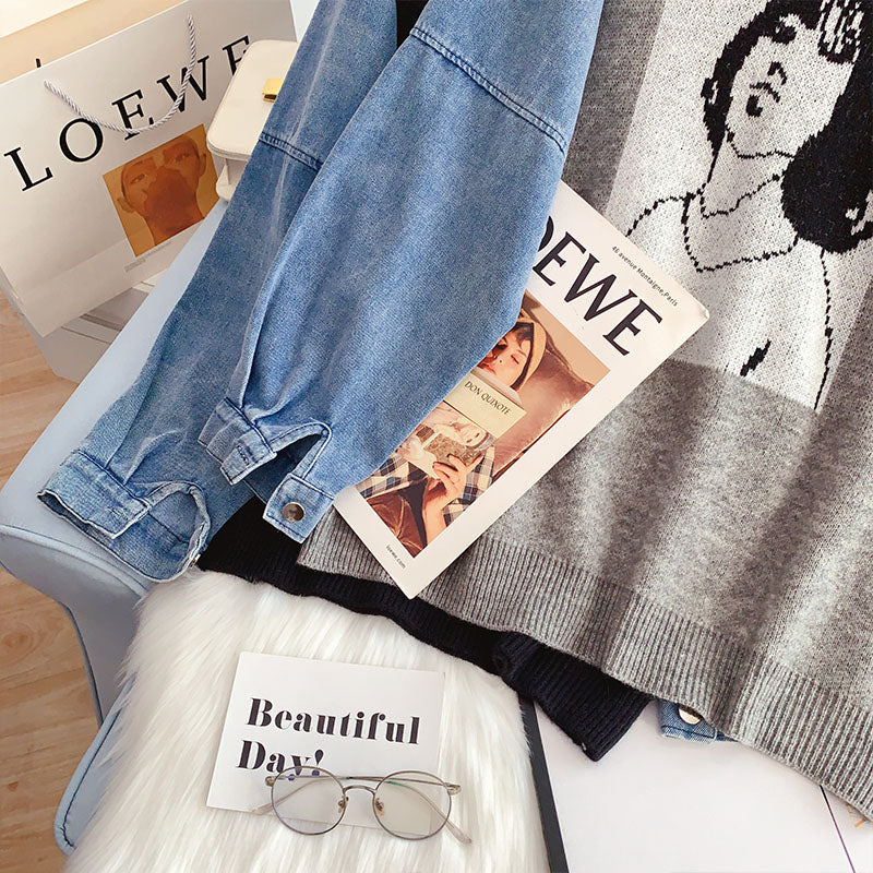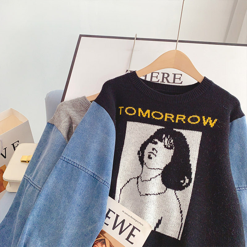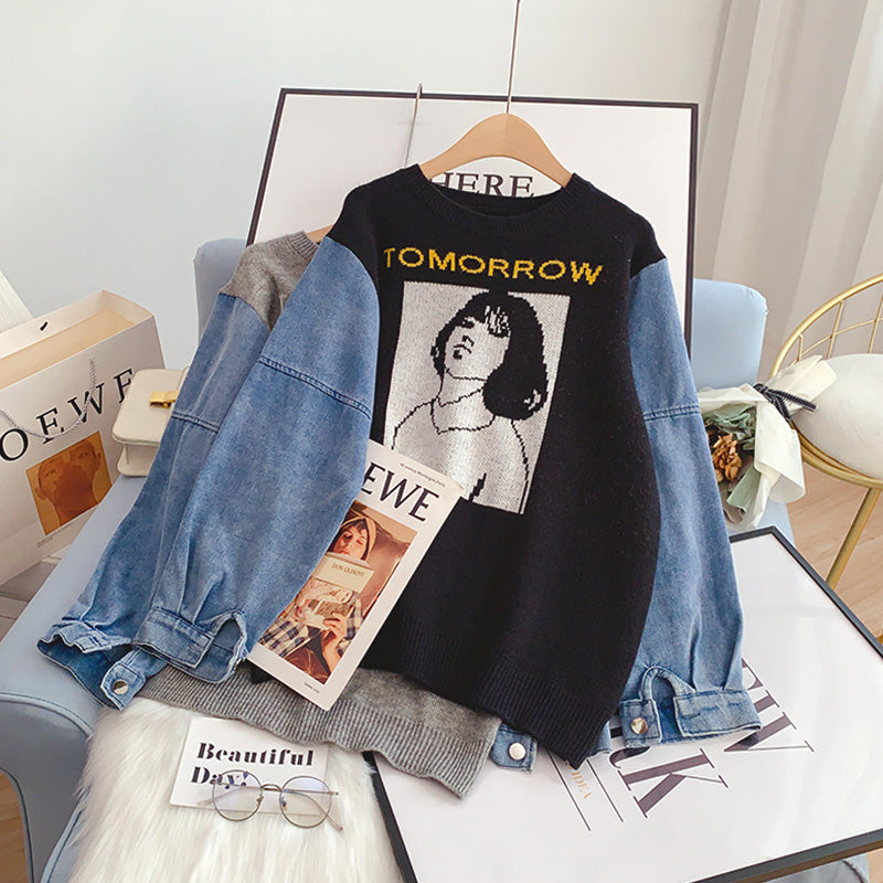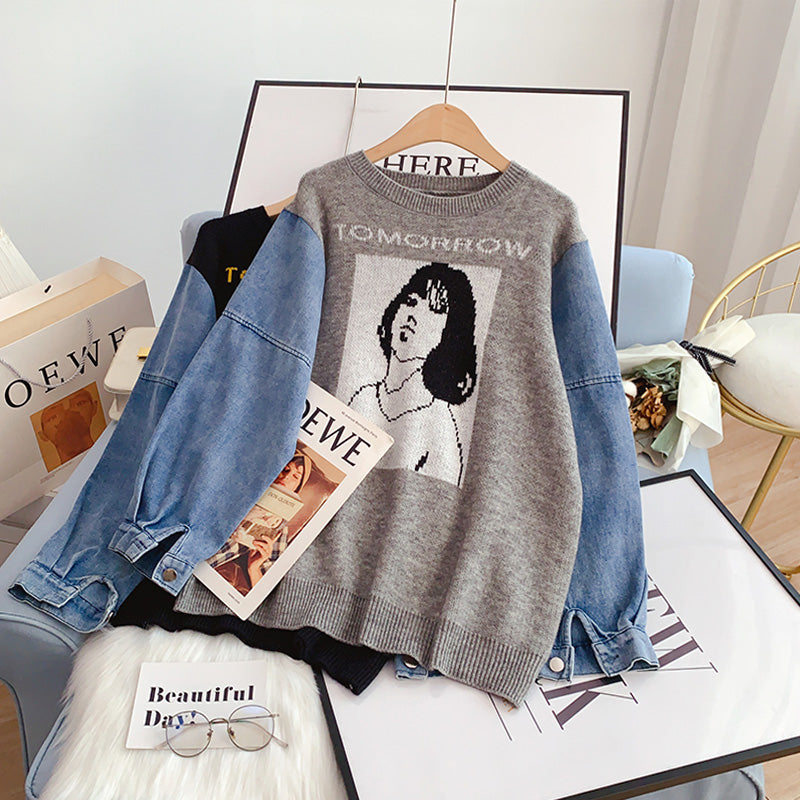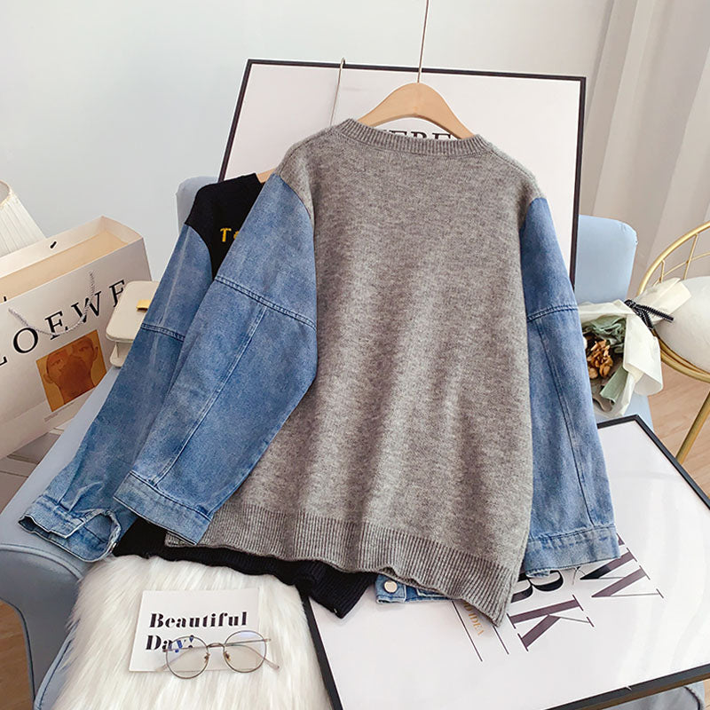 Design sense denim stitched sweater fake two women's Retro port flavor 5050