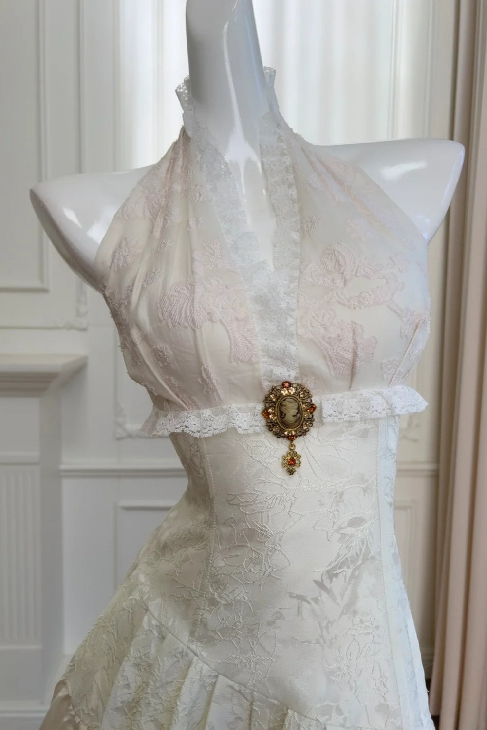 girlhomeshops-Vintage Lace Jacquard Halter Evening Dress, Long Sleeveless Elegant Party Gown gh5902