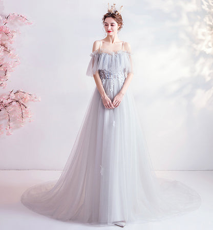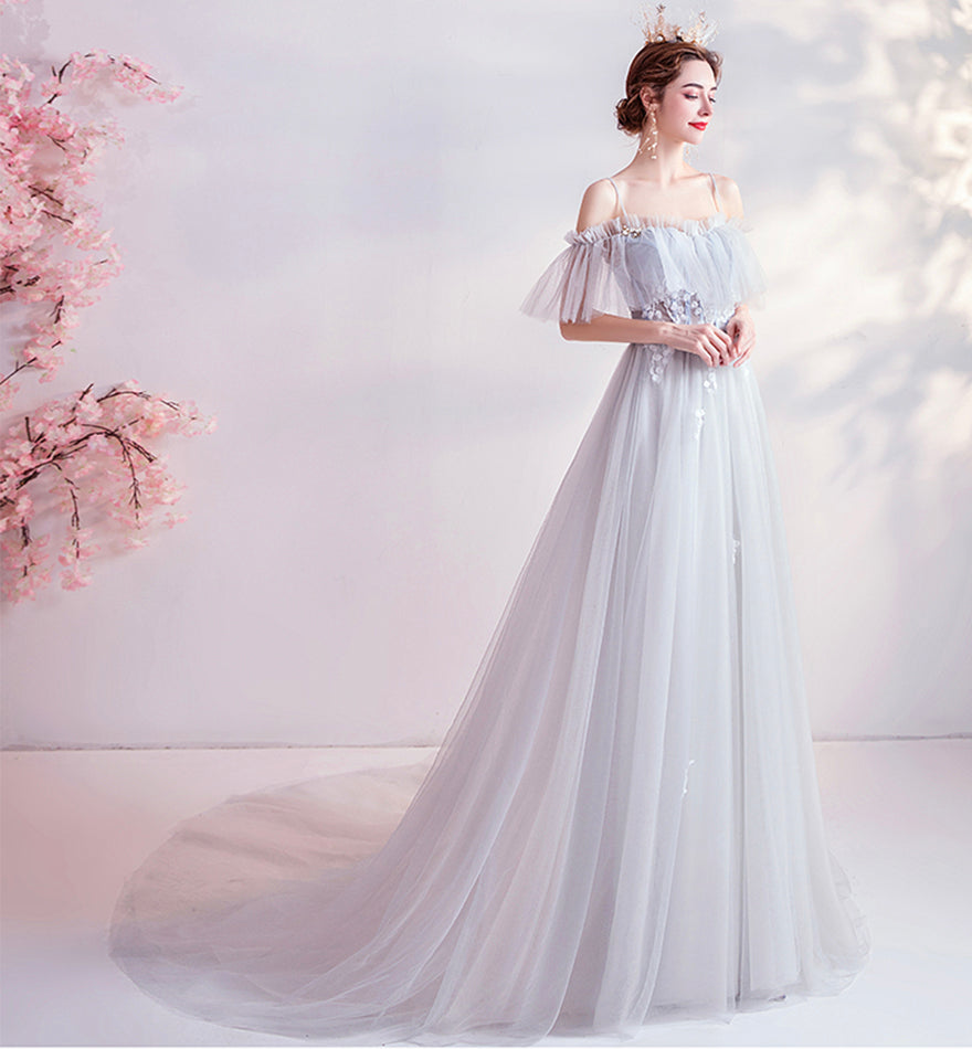 Gray tulle lace long prom dress evening dress