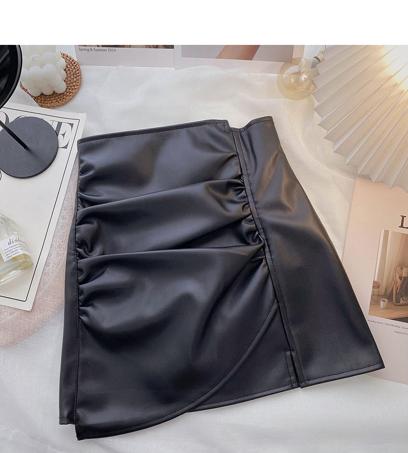 High waist pleated design, irregular, slim, hip wrapped leather skirt 5323