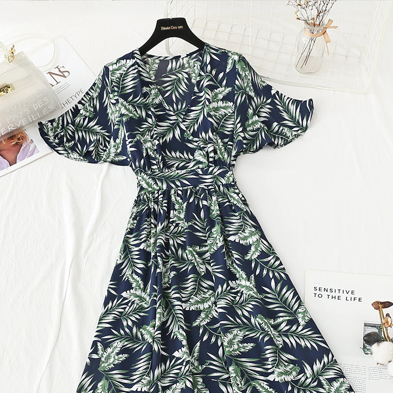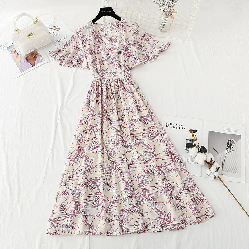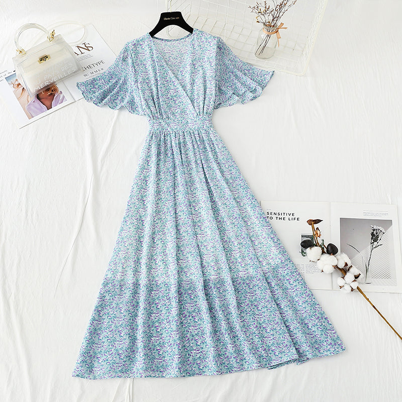New tea break French chiffon long skirt V-neck waist slim A-line skirt 4889