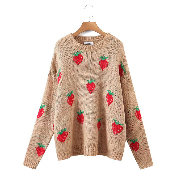 Strawberry jacquard mohair sweater loose round neck top 7743